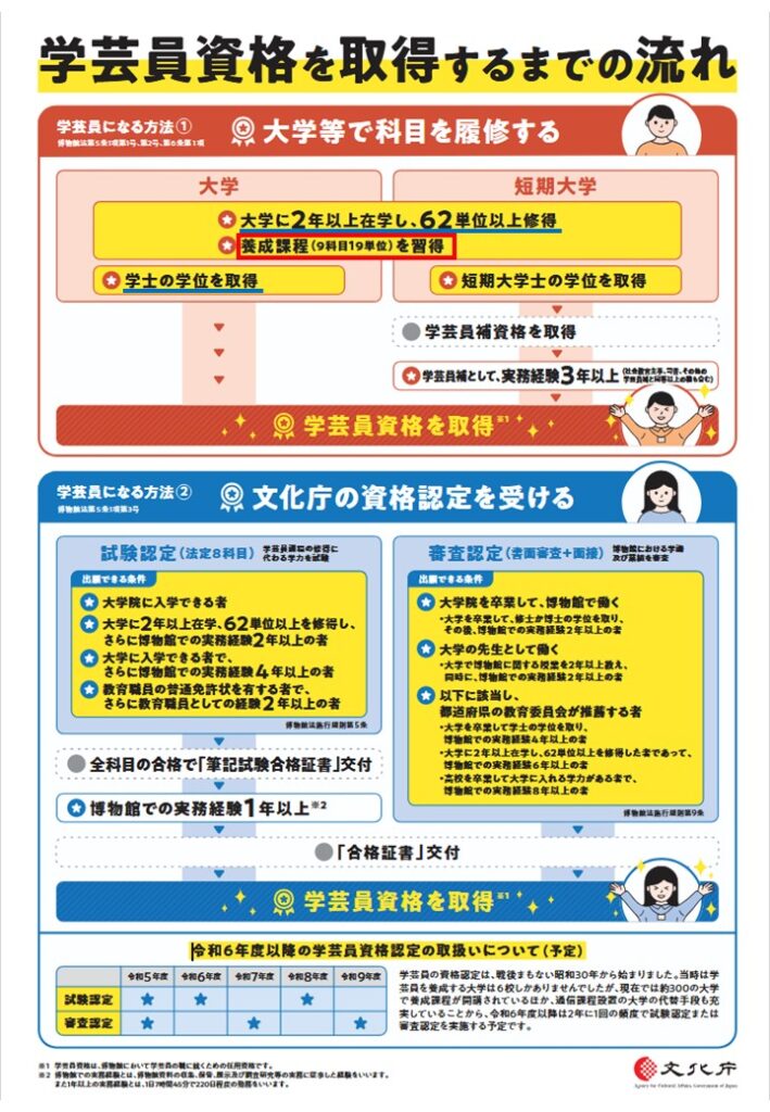 文化庁のサイトにあるフローチャートが分かりやすいので転載します。「学芸員になる方法① 大学等で科目を履修する」の青線が私が満たしている項目、赤枠が学芸員資格取得のために必要な項目です。